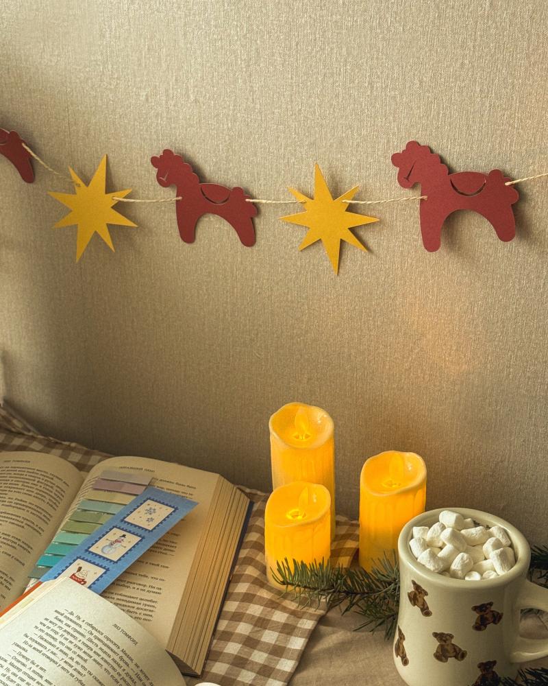 Гирлянда из дизайнерского картона станет отличным украшением для вашего пространства. Ей можно украсить спальню, гостиную, детскую и даже ваше рабочее место. Гирлянда может быть прекрасным подарком или покупкой для обустройства своего пространства. Длина гирлянды — 1,5 метра, что позволяет оптимально разместить её на вашей стене. Нить гирлянды хлопчато-бумажная, гирлянда держит свою форму за счёт плотности нити и картона, из которого она изготовлена.